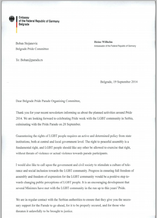 Auf der Pride Parade liefen auch der deutsche Botschafter Heinz Wilhelm und der Botschafter der USA mit. Mehrere Vertretungen von EU-Staaten hatten zuvor in einem Brief ihre Unterstützung für den Umzug deutlich gemacht. Für die EU ist der Schutz der Demonstrationsfreiheit und anderer Grundrechte ein entscheidender Punkt in den Verhandlungen mit Serbien. Miletić sagt: “Die Pride Parade war die Chance für die Regierung zu zeigen, dass sie die Rechte von Minderheiten schützt.” Er glaubt, dass vom Einsatz der LGBT-Aktivisten alle Minderheiten in Serbien profitieren können: “Wenn eine Gruppe so etwas kann, kann es jede Gruppe.”