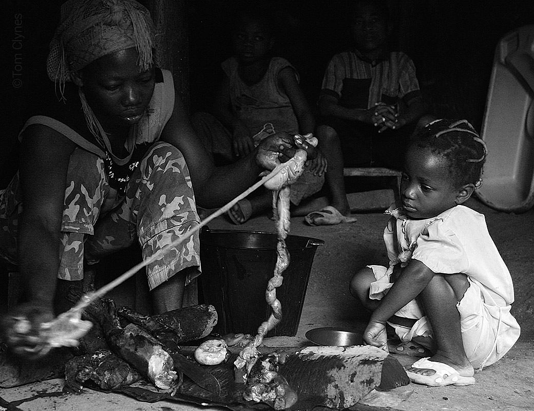 Sandrine nimmt ein kleineres Messer, um den Affenkörper bis auf die Eingeweide für den Verzehr vorzubereiten. Als sie bemerkt, wie die Kinder unruhig werden, greift sie in den Brustkorb, schneidet Herz und Leber heraus und wirft ihnen die labberigen Organe hin. Die Kinder rollen sie zwischen ihren Händen wie Knete.