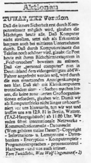 Unsere Reihe startet am 12.September des Jahres 1981 am Tisch der Kommune Eins in der taz-Redaktion. Am Tisch versammelt: Die Initiatoren des ersten „Komputerfriektreffens“ Klaus Schleisiek (alias Tom Twiddlebit), Herwart Holland-Moritz (alias Wau Holland), Wulf Müller und Jochen Büttner sowie rund 20 weitere Teilnehmer. Der Grund für das Treffen: Wat tun. Was „wat“ ist? Die Antwort findet sich in der Einladung zum Treffen, abgedruckt in der taz vom 01. September 1981: