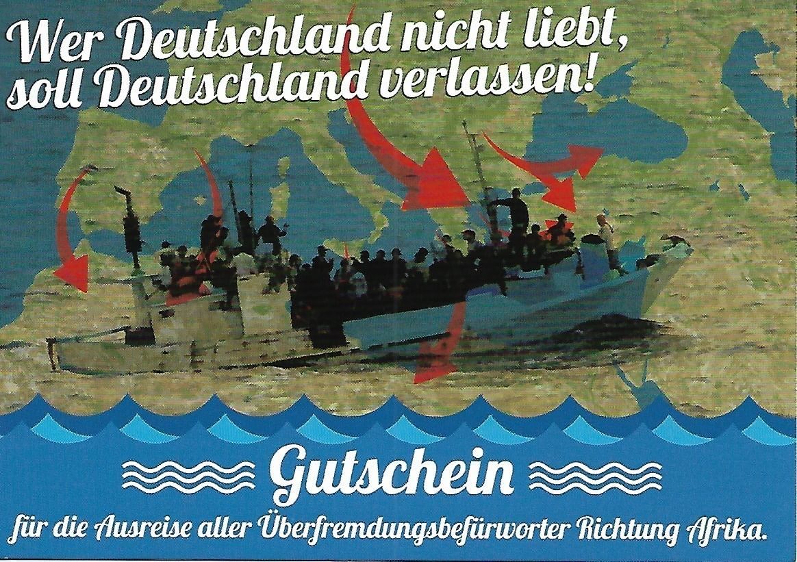 „Alle Unterstützer der volksfeindlichen Politik der Bundesregierung“, hieß es da, „fordern wir auf, das Land zu verlassen“ – und zwar wahlweise „mit einem Boot“, „über die Balkanroute“ oder mit dem Flugzeug.