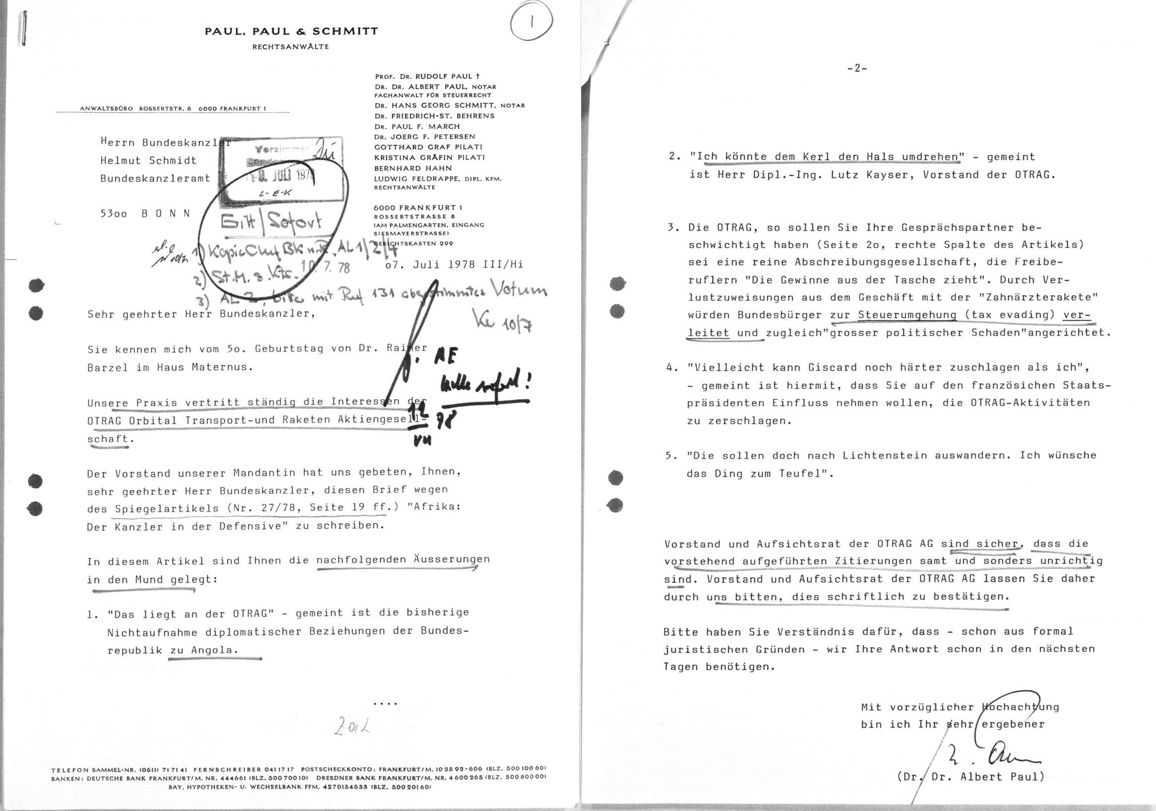 Kayser betont in Interviews immer wieder, dass er Helmut Schmidt ein Dorn im Auge gewesen sei. Dass von höchster Stelle der Befehl gekommen sei, ihn auszubooten. Viele haben darin nur die Rechtfertigungen eines Gescheiterten gesehen, der sein Lebenswerk verteidigen will. Aber Archivunterlagen des Bundeskanzleramts, die ich hier erstmals veröffentliche, zeigen, dass er recht hat. Zusammen mit Frankreich hat die Bundesregierung die Geschäfte von Kaysers Firma, der Orbital Transport- und Raketen Aktiengesellschaft (Otrag) empfindlich gestört.