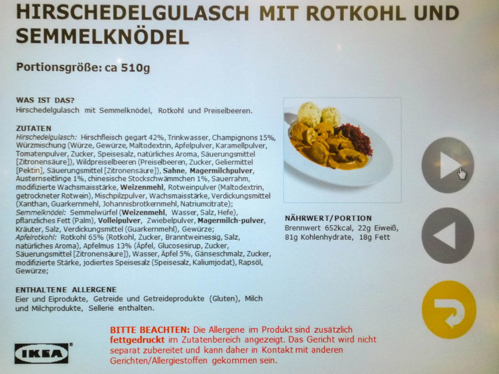Beim Verkauf von Lebensmitteln müssen seit Ende 2014 Zutaten und Nährwerte angegeben werden. Das gilt laut Lebensmittel-Informationsverordnung (LMIV) allerdings nur für vorverpackte, nicht für „lose Ware“, etwa in Großküchen und Restaurants. Ikea ist per Gesetz lediglich verpflichtet, über Zusatzstoffe und Allergene zu informieren.