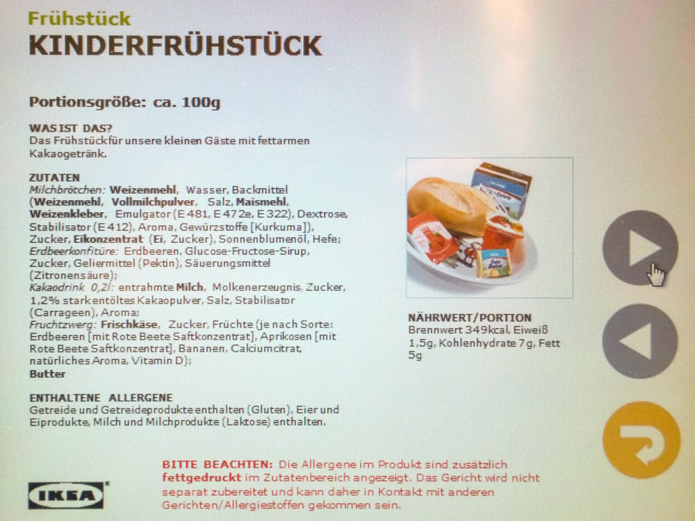 Eine solche Auflistung stellt Ikea derzeit online nicht zur Verfügung. In den Restaurants weist Ikea seine Kunden darauf hin, die Daten an einem „Infoboard“-Touchscreen vor der Kasse einsehen zu können („Food Facts“). Auf diese Angaben beziehen sich die folgenden Punkte.