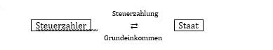 Der Staat wird somit künftig zwischen leistungsfähiger Person und bedürftiger Person »zwischengeschaltet«. Dabei kommt in der Summe nicht mehr Geld bei den Empfängern an als zuvor von den Verpflichteten (sprich: Steuerzahlern) eingesammelt wurde. Das Grundeinkommen würde dieses System insoweit auf die Spitze treiben, als künftig auch Personen, die ihr Existenzminimum selbst decken können, den Geldbetrag für ein Grundeinkommen erst beim Staat einzahlen und ihn dann wieder vom Staat erhalten: