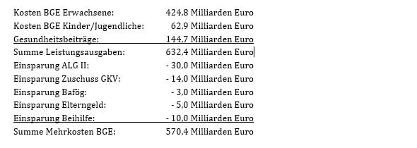 Insgesamt ist also mit Ausgaben von bis zu 632,4 Milliarden Euro pro Jahr zu rechnen, wenn man davon ausgeht, dass nahezu alle Einwohner in Deutschland bezugsberechtigt wären. Bei dieser Zahl handelt es sich jedoch nur um die Bruttosumme, die die Grundeinkommensbehörden künftig verwalten würden. Es handelt sich nicht um die (Mehr-)Kosten, die durch die Einführung eines bedingungslosen Grundeinkommens entstehen würden. Von dieser Bruttosumme sind nämlich die Entlastungen bei Sozialleistungen abzusetzen, die der Staat an anderer Stelle einsparen könnte (eine wesentliche Einsparung an Verwaltungskosten wird hier aus Vorsichtsgründen jedoch nicht unterstellt, da dies als zu unsicher erscheint).