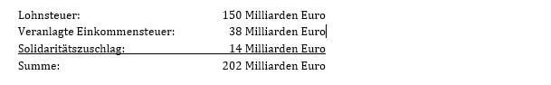 Zurzeit werden aus Lohnsteuer, veranlagter Einkommensteuer und Solidaritätszuschlag (künftig wegfallend) folgende jährliche Aufkommen erzielt :