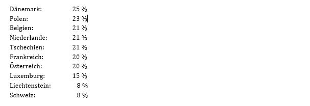 Die regulären Umsatzsteuertarife in unseren europäischen Nachbarländern liegen derzeit bei folgenden Werten:
