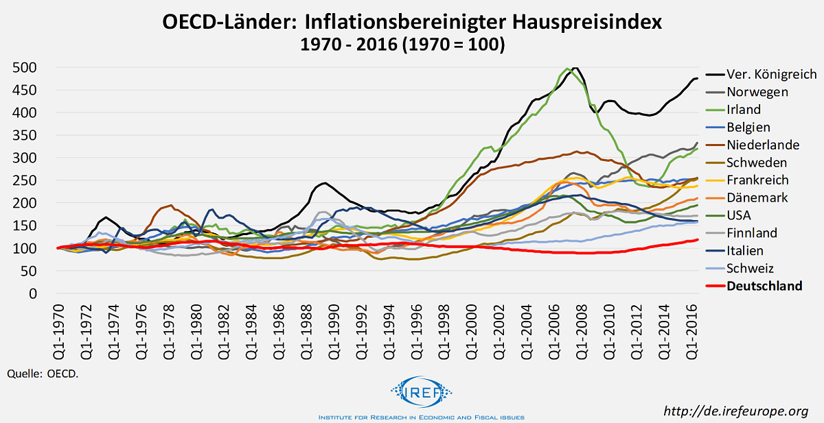 Diese Abbildung zeigt die Hauspreisentwicklung in verschiedenen Ländern. Es fällt auf, dass die Schwankungen in Deutschland relativ gering waren im Vergleich zu anderen Ländern. Man sieht auch, dass die Preise immer wieder gestiegen und gefallen sind.