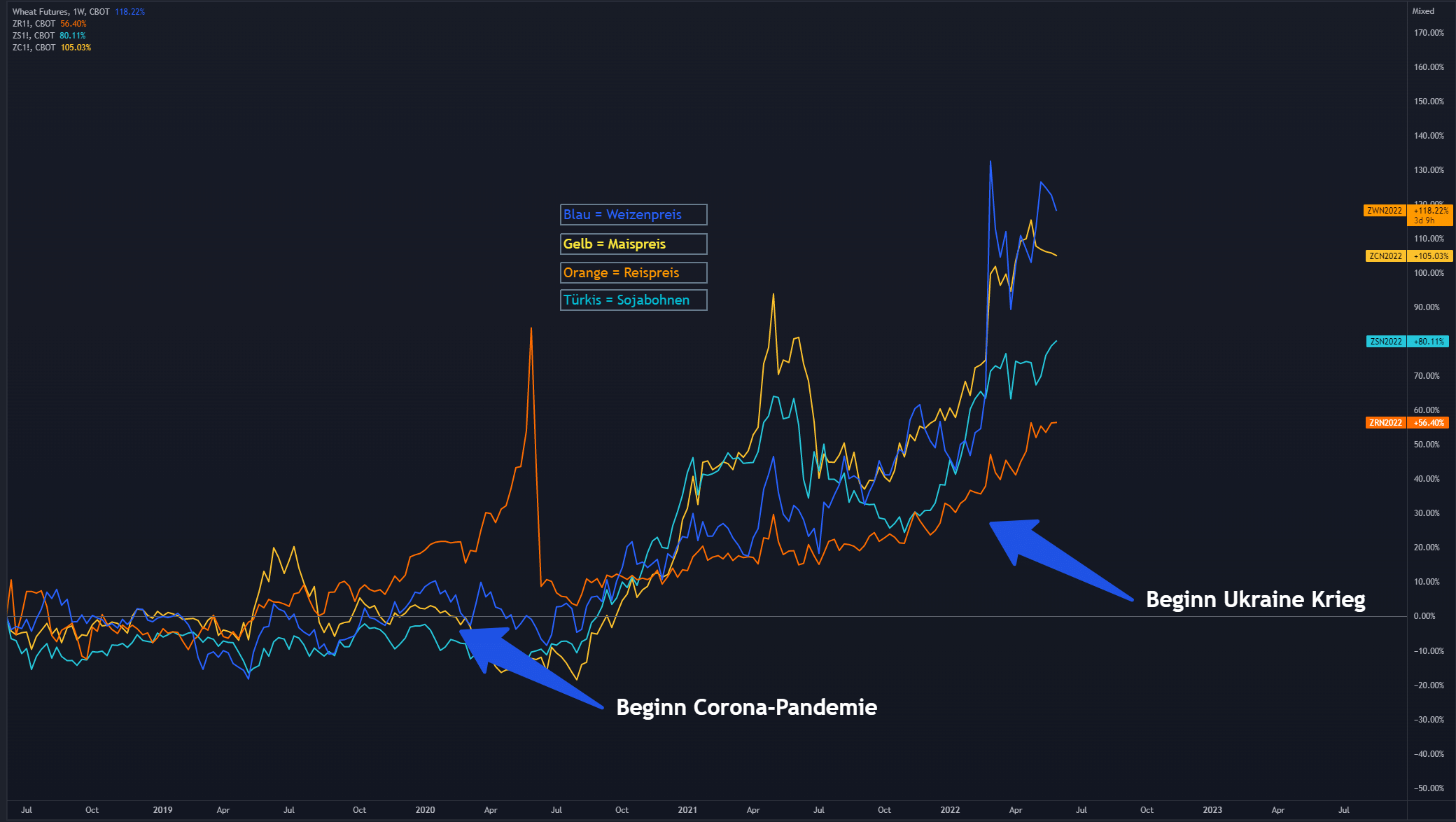 Diese Entwicklung begann lange vor dem Krieg. Bereits im Dezember warnte etwa das International Fertilizer Development Center, dass die hohen Düngemittelpreise die Versorgung von 100 Millionen Menschen in Sub-Sahara-Afrika gefährden. Ein Blick auf die Börsenpreise für Weizen, Reis, Soja und Mais zeigt das gleiche. Seit Beginn der Corona-Pandemie steigen die Preise: