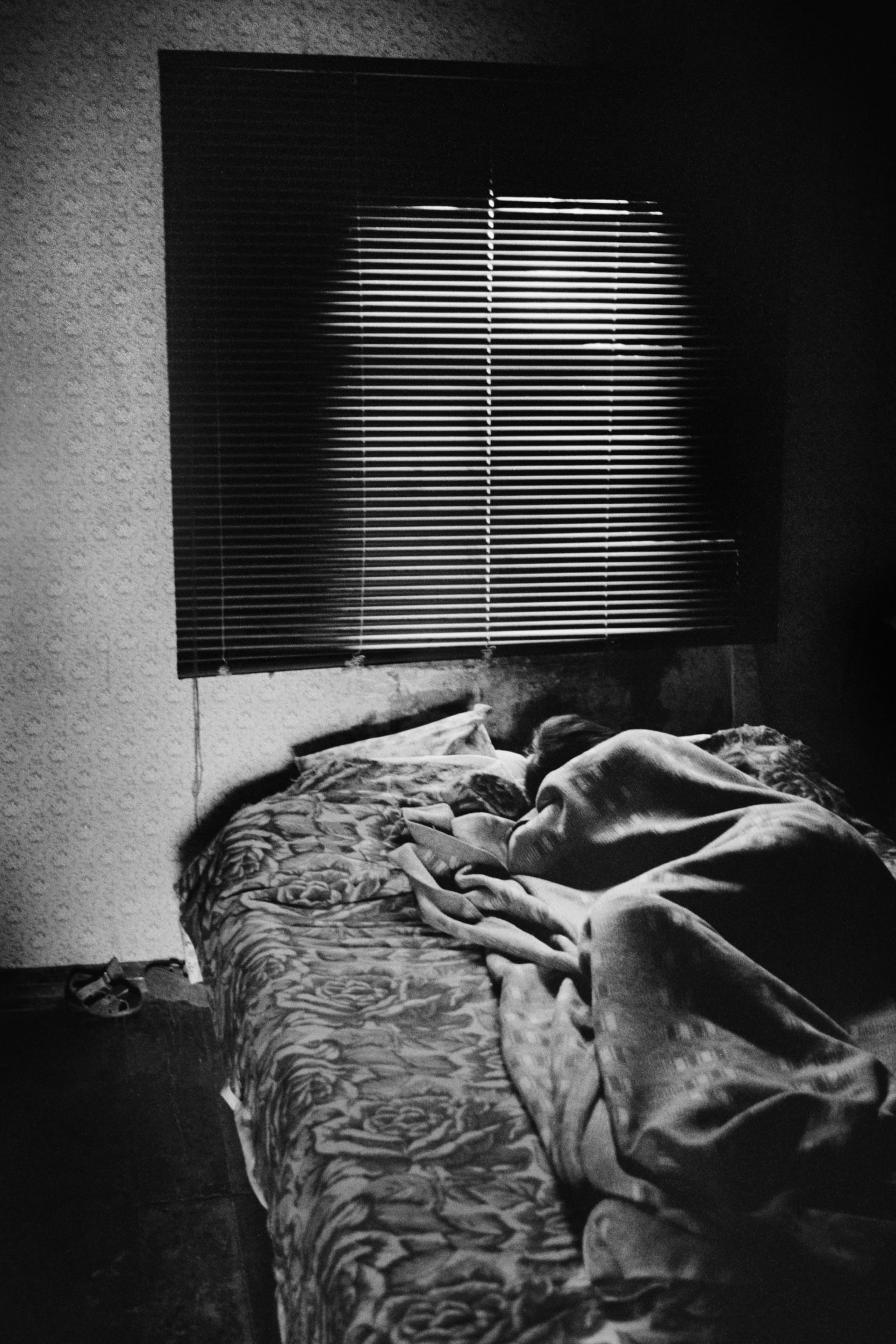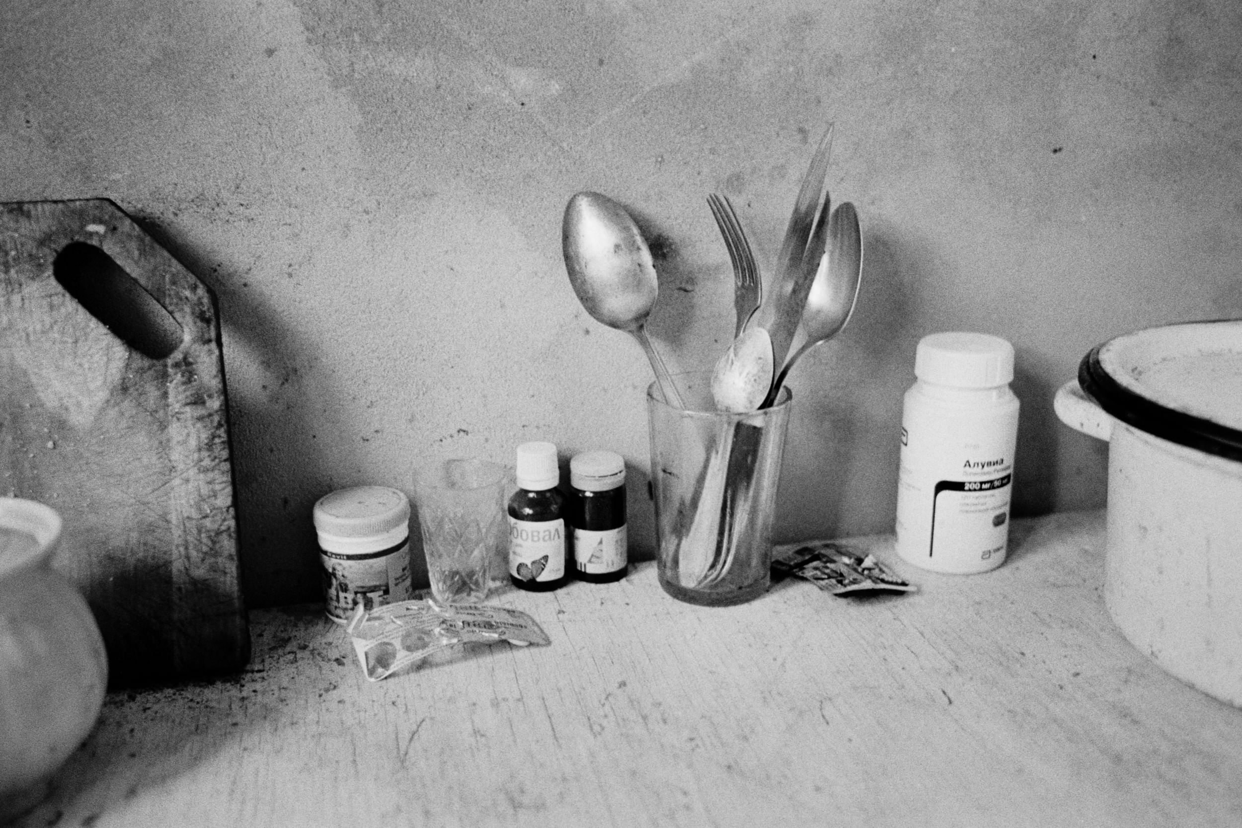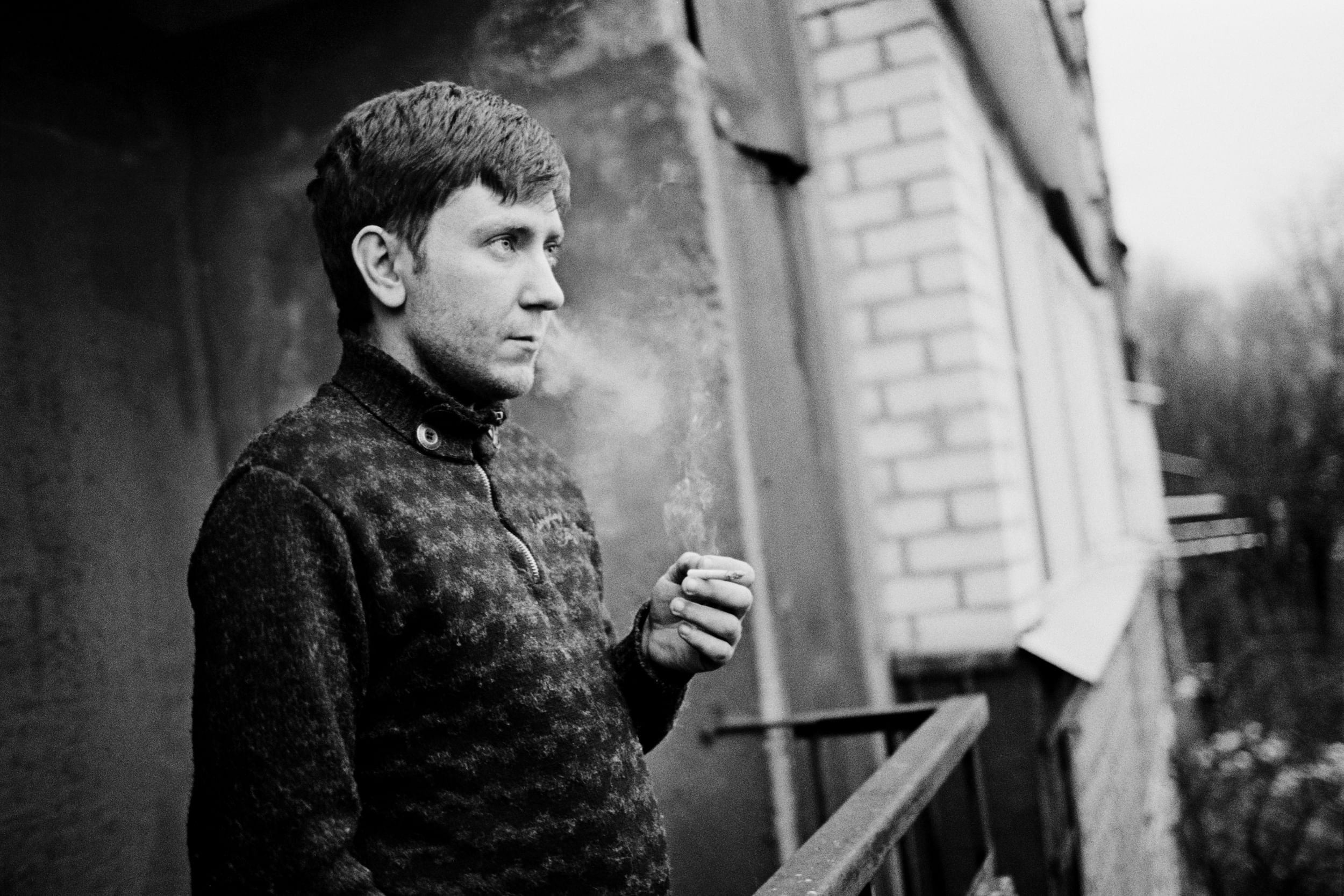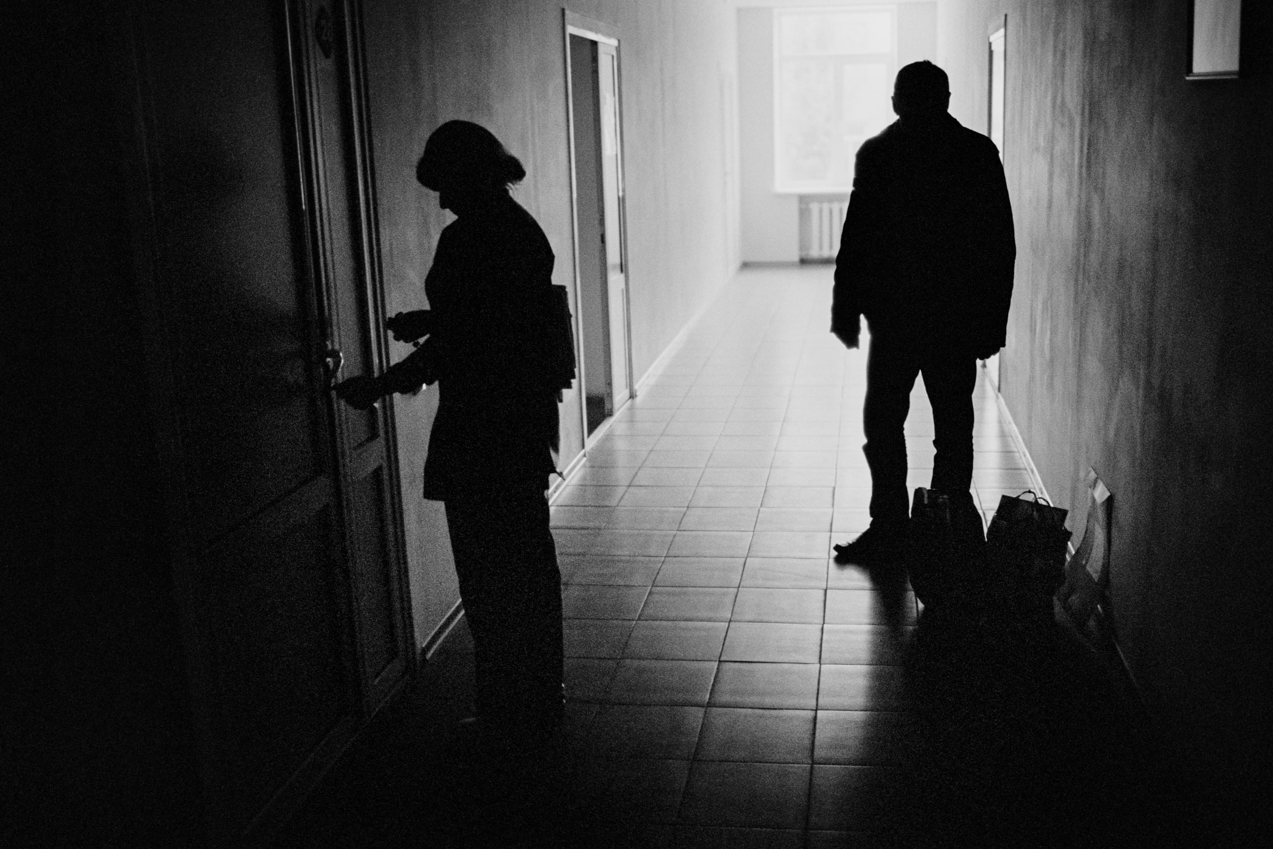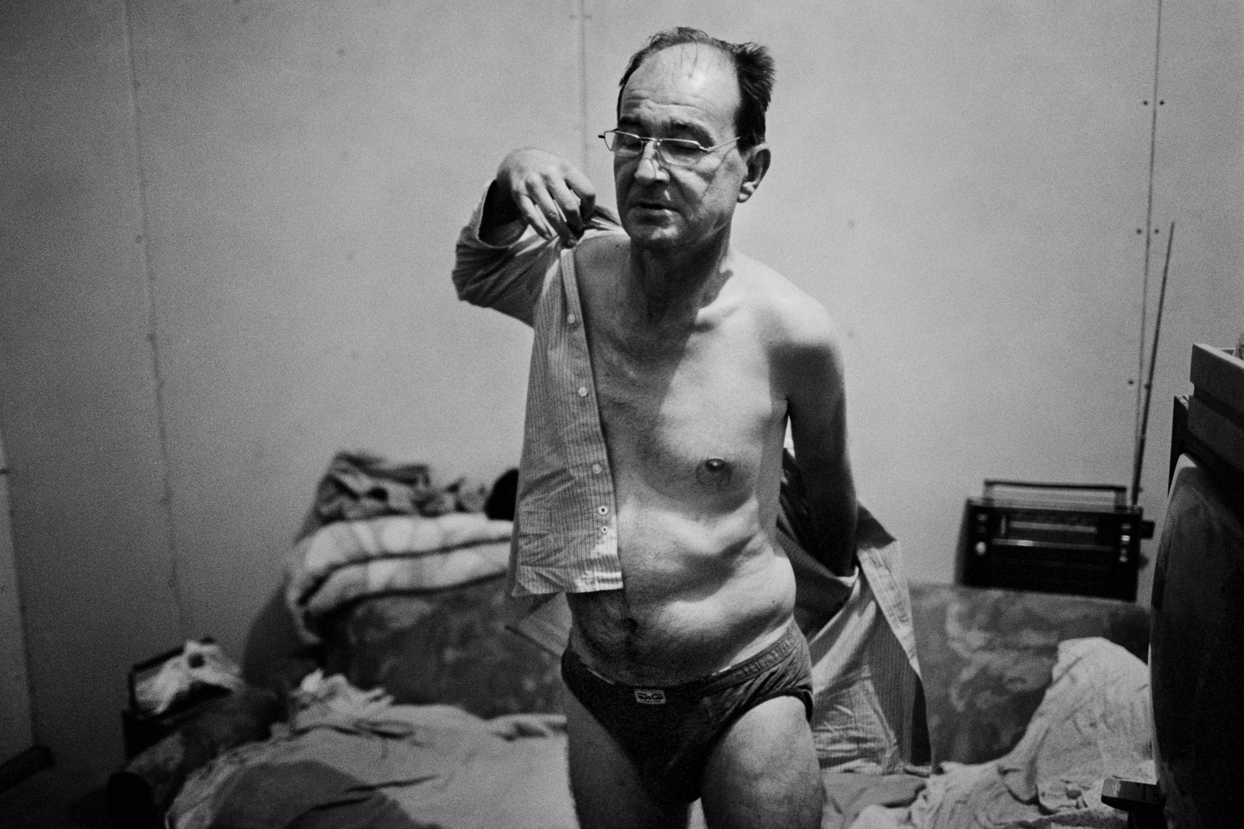 Kolya (geboren 1961) im Flur des Aids-Krankenhauses in Donezk. Er verbrachte über 20 Jahre seines Lebens im Gefängnis und infizierte sich dort über den Konsum von Drogen mit HIV. Nach seiner letzten Haftentlassung im Sommer 2013 lebte er drei Monate bei Bekannten und auf der Straße. Der Aufenthalt im Krankenhaus bedeutete für ihn die dringend nötige ärztliche Versorgung und eine sichere Bleibe für die kommenden Monate.