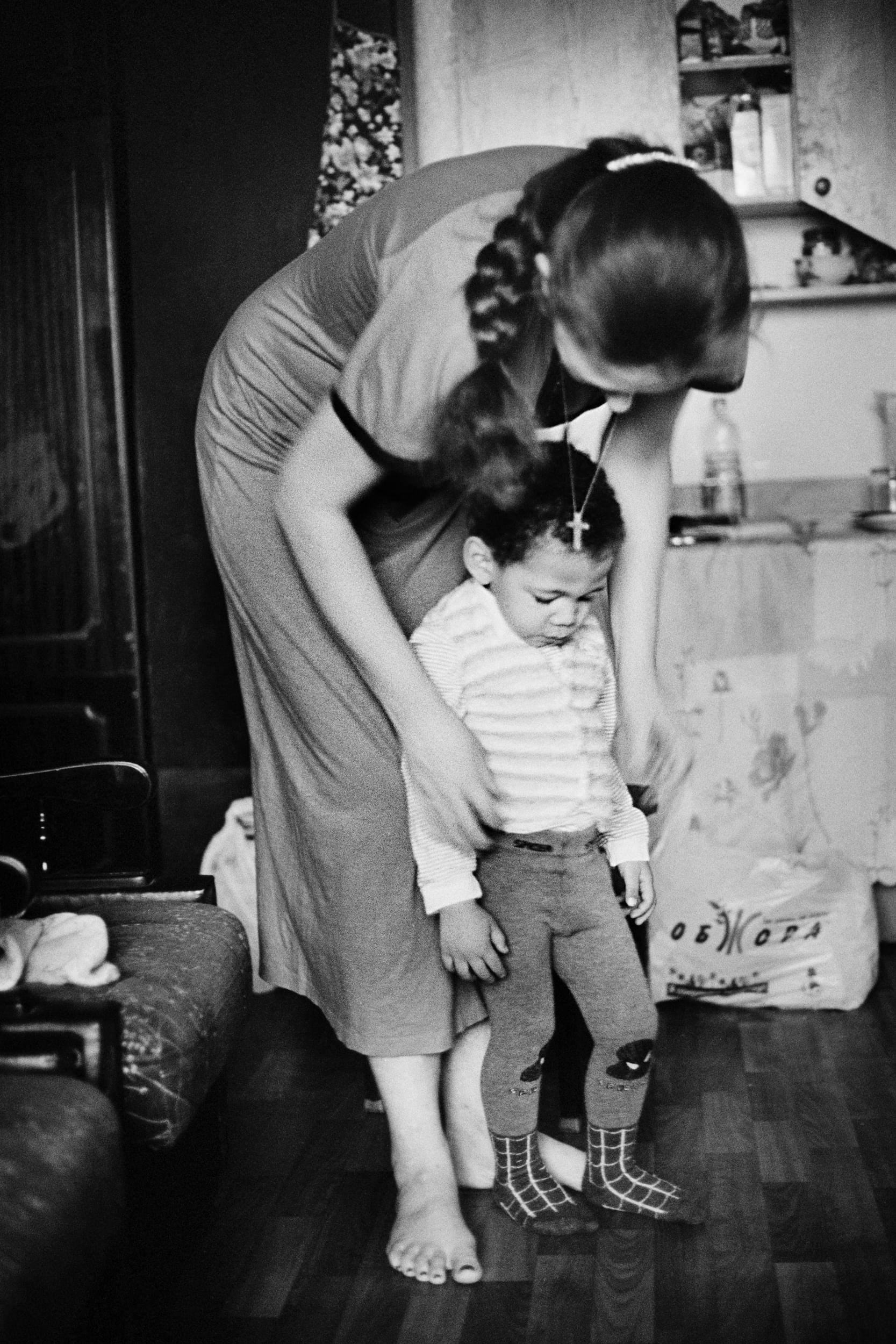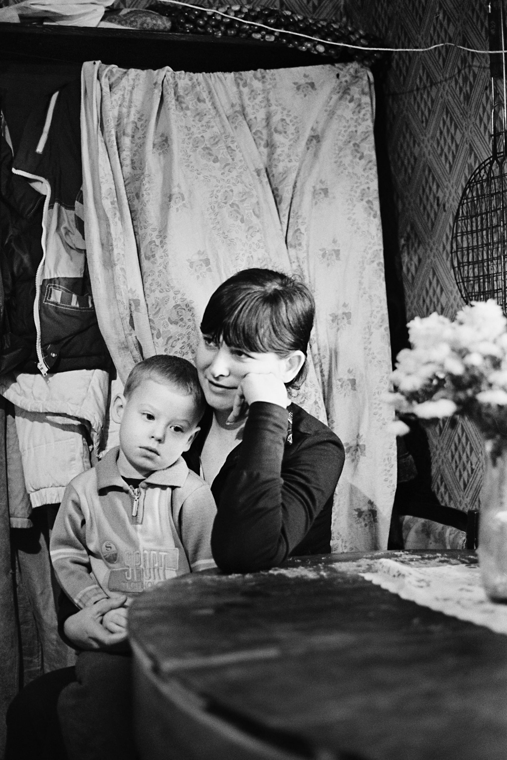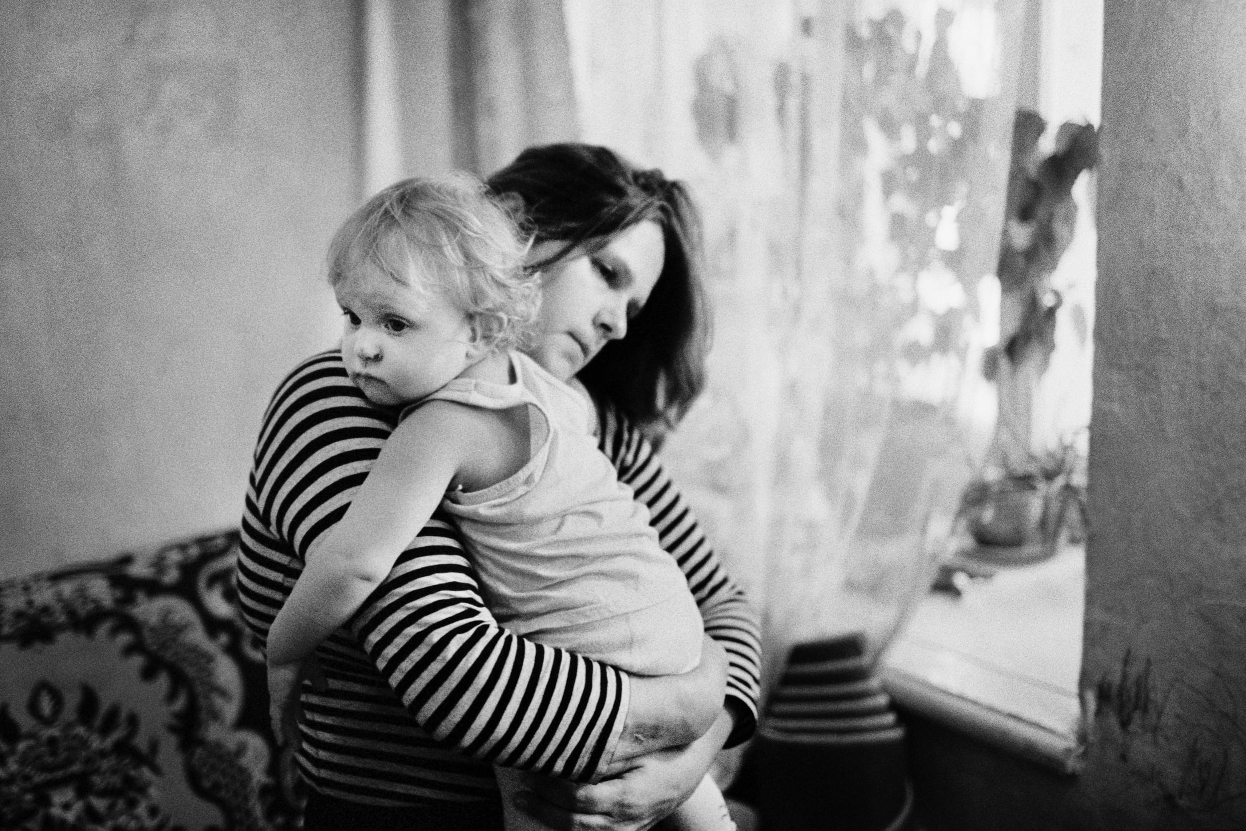 Katja (geboren 1981) mit ihrem dreijährigen Sohn Jenja. Ihr Mann Ruslan nahm jahrelang massiv Drogen und infizierte erst sich und später Katja mit HIV. Ihr gemeinsames Kind Jenja kam gesund zu Welt. Trotz der heftigen Kämpfe um Donezk lebt die Familie weiterhin in der Stadt.