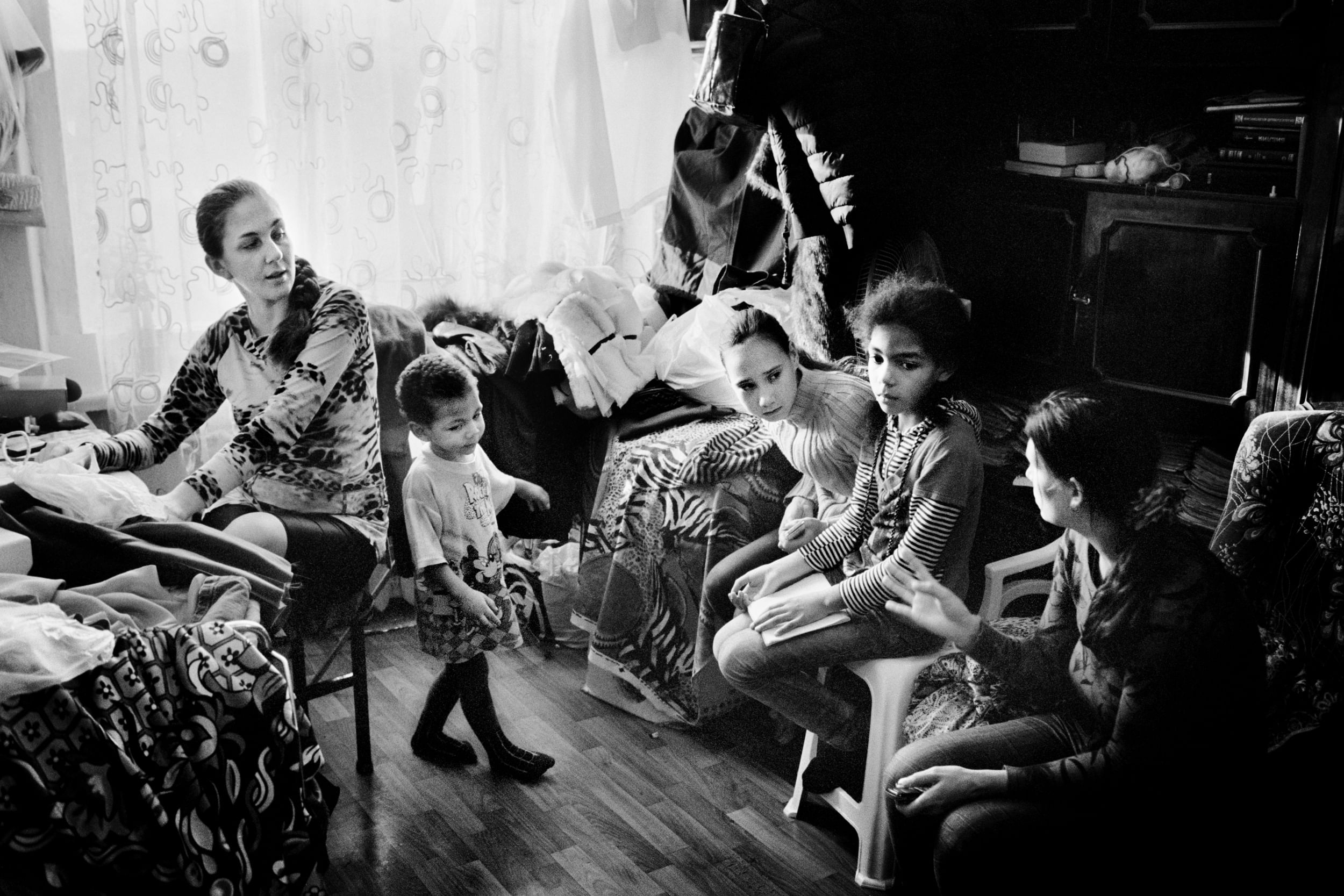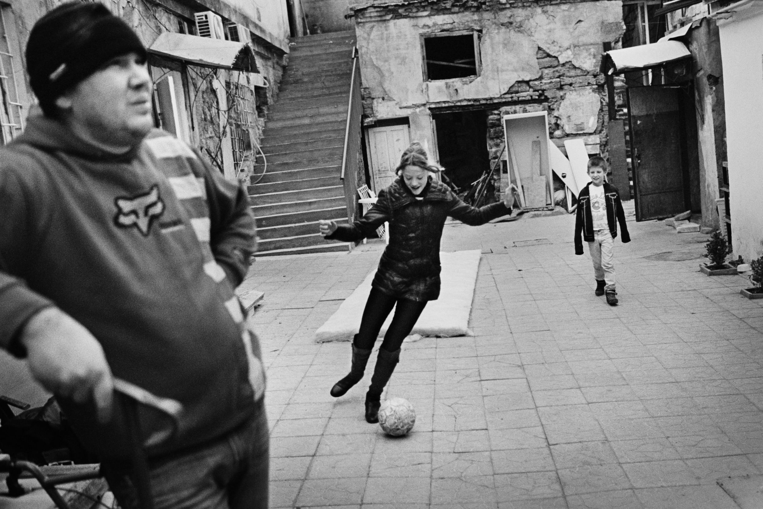Olya und Verenika. Obwohl die Familie weit unter dem Existenzminimum lebt, versucht Olya, ihren Kindern ein weitestgehend unbeschwertes Leben zu ermöglichen. Der extreme Wertverlust der ukrainischen Währung Griwna, für den der Krieg in der Ostukraine und die damit einhergehende wirtschaftliche Krise verantwortlich sind, erschwert das tägliche Überleben vieler Betroffener und ihrer Familien zusätzlich.