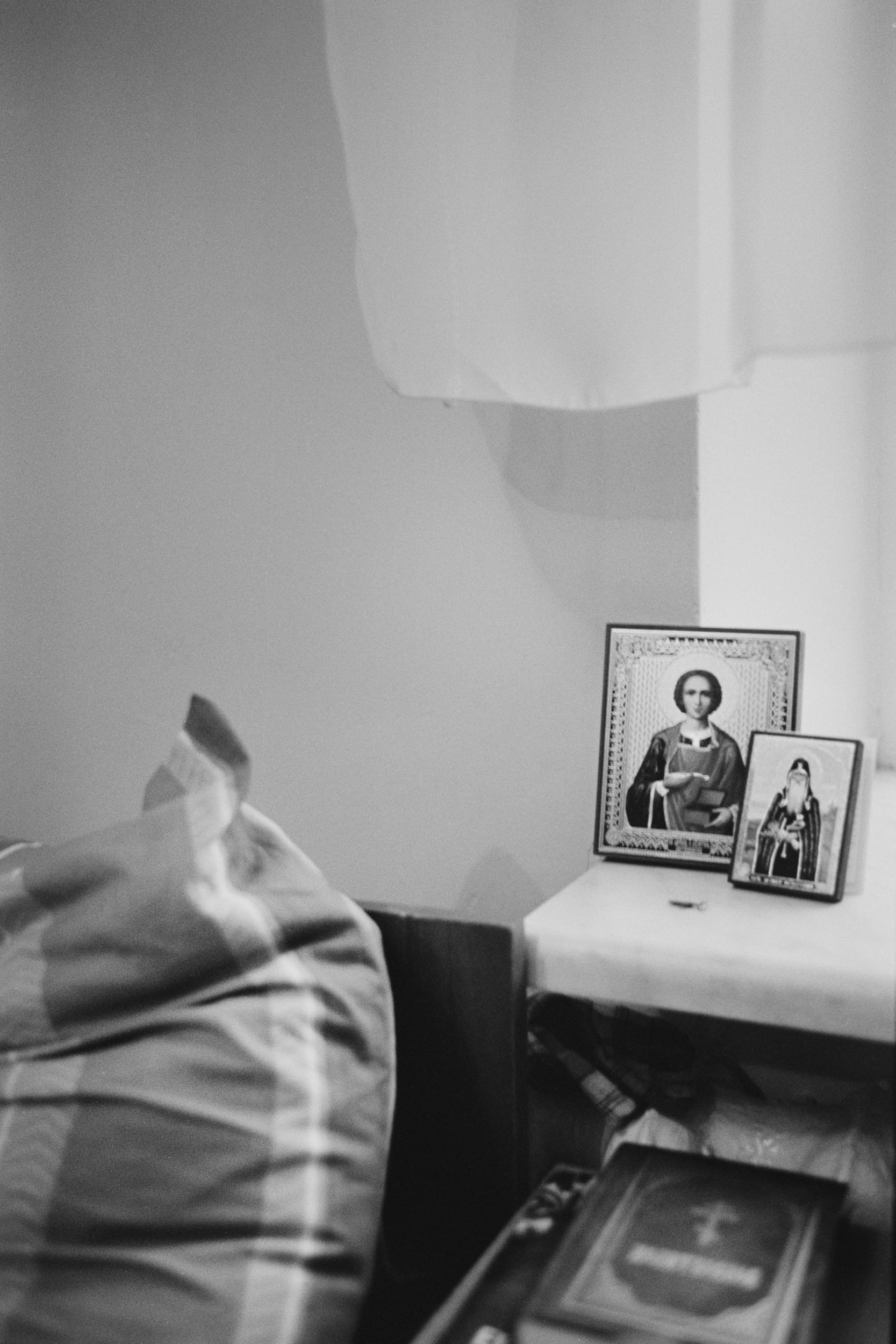 Bilder orthodoxer Heiliger neben einem Bett im Aids-Krankenhaus von Odessa.