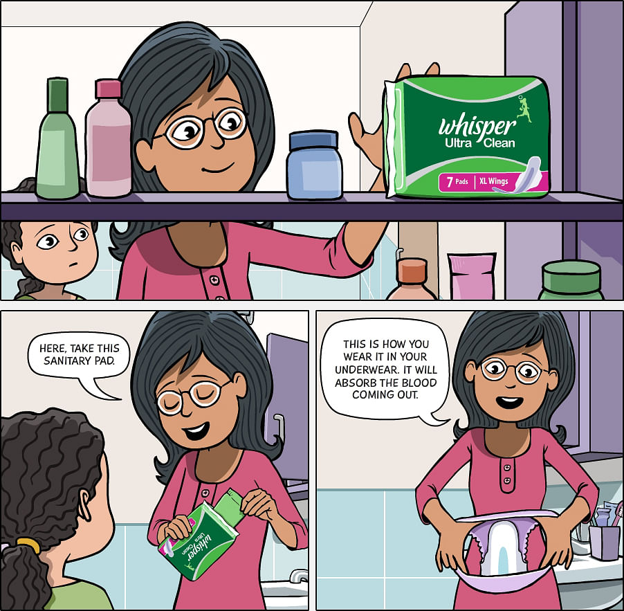 Hier könnte die Geschichte der indischen Menstruationspioniere ein vorläufiges Happy End haben - wenn es nicht noch einen dritten Protagonisten gäbe. Den entdeckt man, wenn man sich das Menstrupedia-Comic etwas genauer ansieht. Auf Seite 25 greift die Ärztin Priya ins Badezimmerregal nach einer Bindenpackung, deren Marke klar erkennbar ist: Es sind keine No-Name-Einlagen, sondern “Whisper Ultra Clean“. Die grüne Verpackung und das Logo sehen den “Always”-Packungen, die man in deutschen Drogerien kaufen kann, verdächtig ähnlich. Und tatsächlich werden sowohl “Whisper” als auch “Always” von Procter & Gamble produziert. Zwischen den Projekten des Menstruations-Manns und dem der beiden Studierenden gibt es also einen entscheidenden Unterschied: “Menstrupedia” wird von einem milliardenschweren Konsumgüterriesen gesponsert.