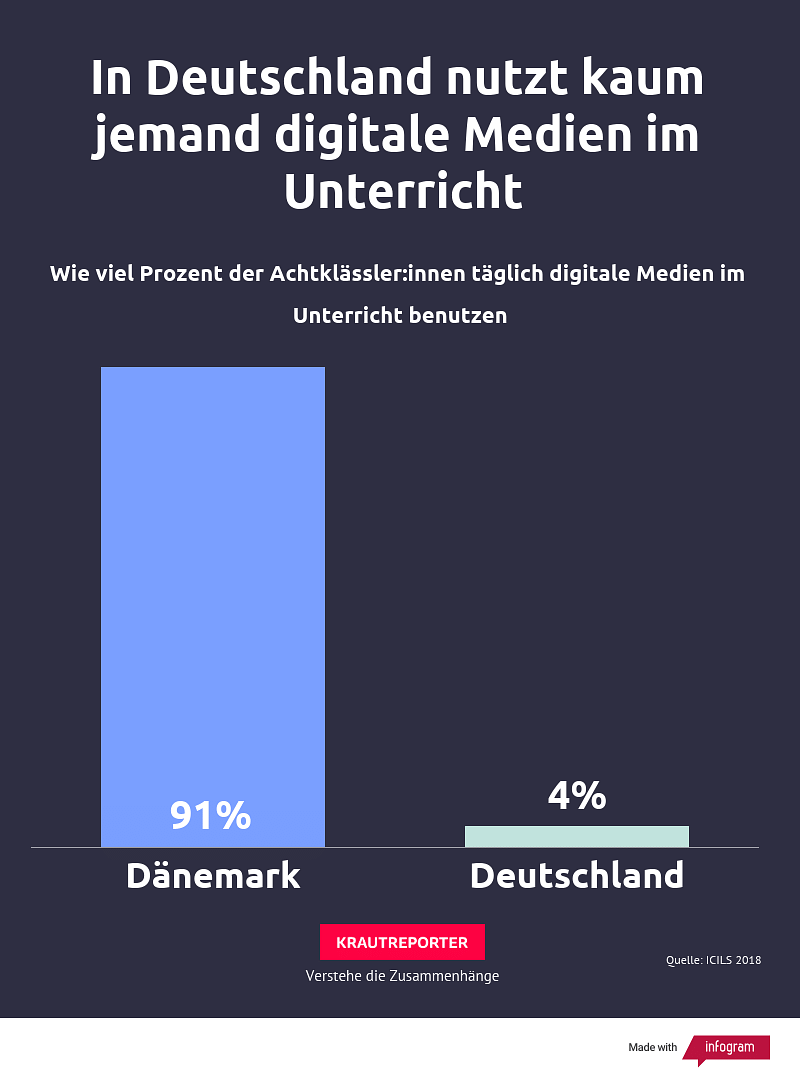 Der digitale Vergleich Deutschland gegen Dänemark ist sowieso ein heftiger. Zeit Online hat ihm einen eigenen Artikel gewidmet, sie fasst zusammen: „Buchstäblich jede dänische Schule verfügt laut ICILS über ein stabiles WLAN-Netz, in Deutschland liegt der Wert bei einem Viertel. Und während in deutschen Schulen sich 17 Prozent der Schüler und Lehrer über eine gemeinsame Lernplattform austauschen, sind es jenseits der Grenze 97 Prozent.“