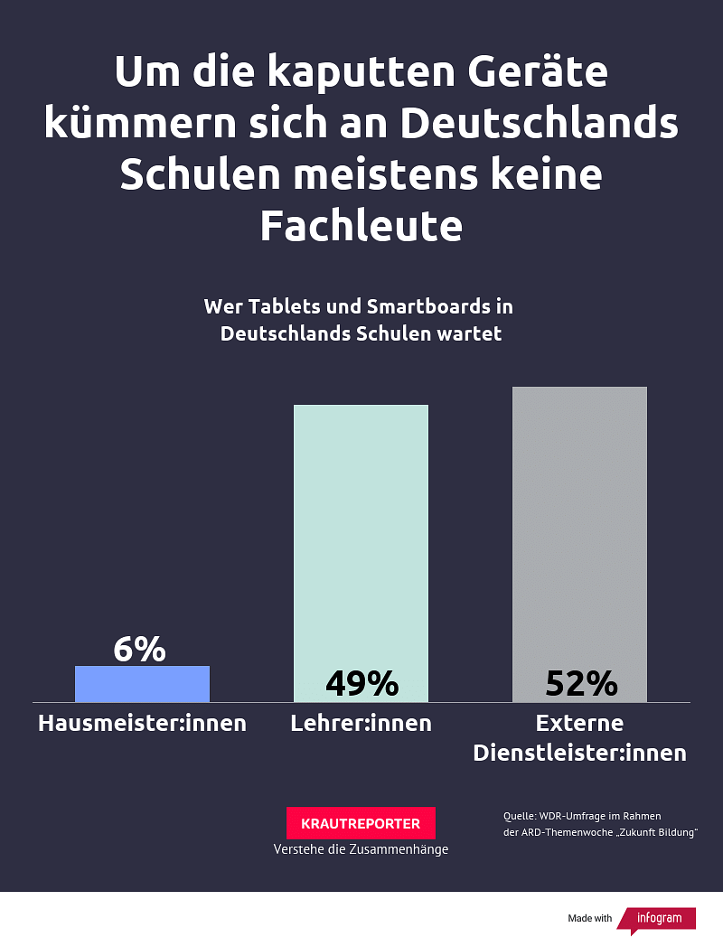 Das ist an kaum einer deutschen Schule Alltag, wie zwei neue Studien belegen. Da ist die ICILS (International Computer and Information Literacy Study) 2018, die unter anderem zeigt, dass Deutschland im internationalen WLAN-Vergleich eher eine runtergerockte Regionalbahn mit „leider defekter“ Toilette als ein moderner Schnellzug ist. In einer Umfrage des WDR haben Schulleitungen und Schüler:innen bewertet, wie gut (also schlecht) ihre Schulen ausgestattet sind. Der Digitalpakt der Bundesregierung mit seinen fünf Milliarden Euro sollte all das besser machen, die Idee ist schon über drei Jahre alt, angekommen ist davon aber bisher in der Breite nichts. Im Unterricht von Sönke Schulmeister wiederum vergeht kaum eine Stunde ohne Tablet und Beamer.