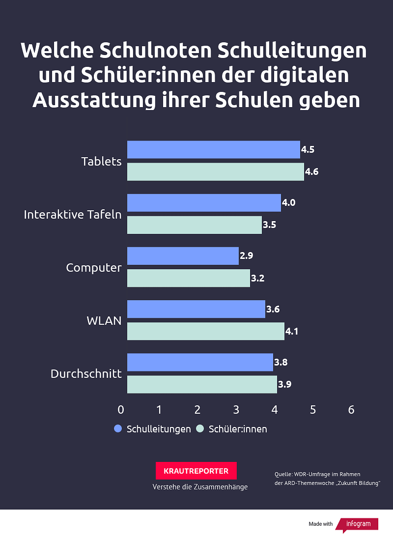 Im Durchschnitt vergeben die Schulleitungen in Deutschland die Note 3,8 für ihre digitale Ausstattung. Die Schüler:innen die Note 3,9 – das heißt eigentlich „ausreichend“, aber reicht das alles wirklich aus, um im Jahr 2019 zeitgemäß zu unterrichten?