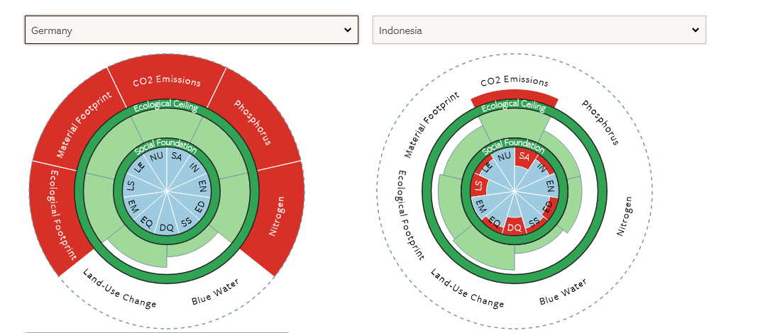 Hilfreich für diese Frage ist auch das Modell der Donut-Ökonomie von Kate Raworth, das soziale und ökologische Grenzen zusammendenkt. Im Loch des Donuts liegen die sozialen Grenzen: In diesen Bereich fallen Menschen, wenn sie nicht genug zu essen bekommen oder keinen Zugang zur Gesundheitsversorgung haben, wenn sie nicht zur Schule gehen können. Außerhalb des Donuts sind aber die ökologischen Grenzen des Planeten überschritten, wie das unsere immer wachsende Wirtschaft verursacht: In Form der Klimakrise, von Luftverschmutzung und Versauerung der Meere. „Wir wollen in den Doughnut“, sagt Kate Raworth. Denn dort sind die grundlegenden Bedürfnisse der Menschen gestillt, ohne das wir die Erde zerstören.