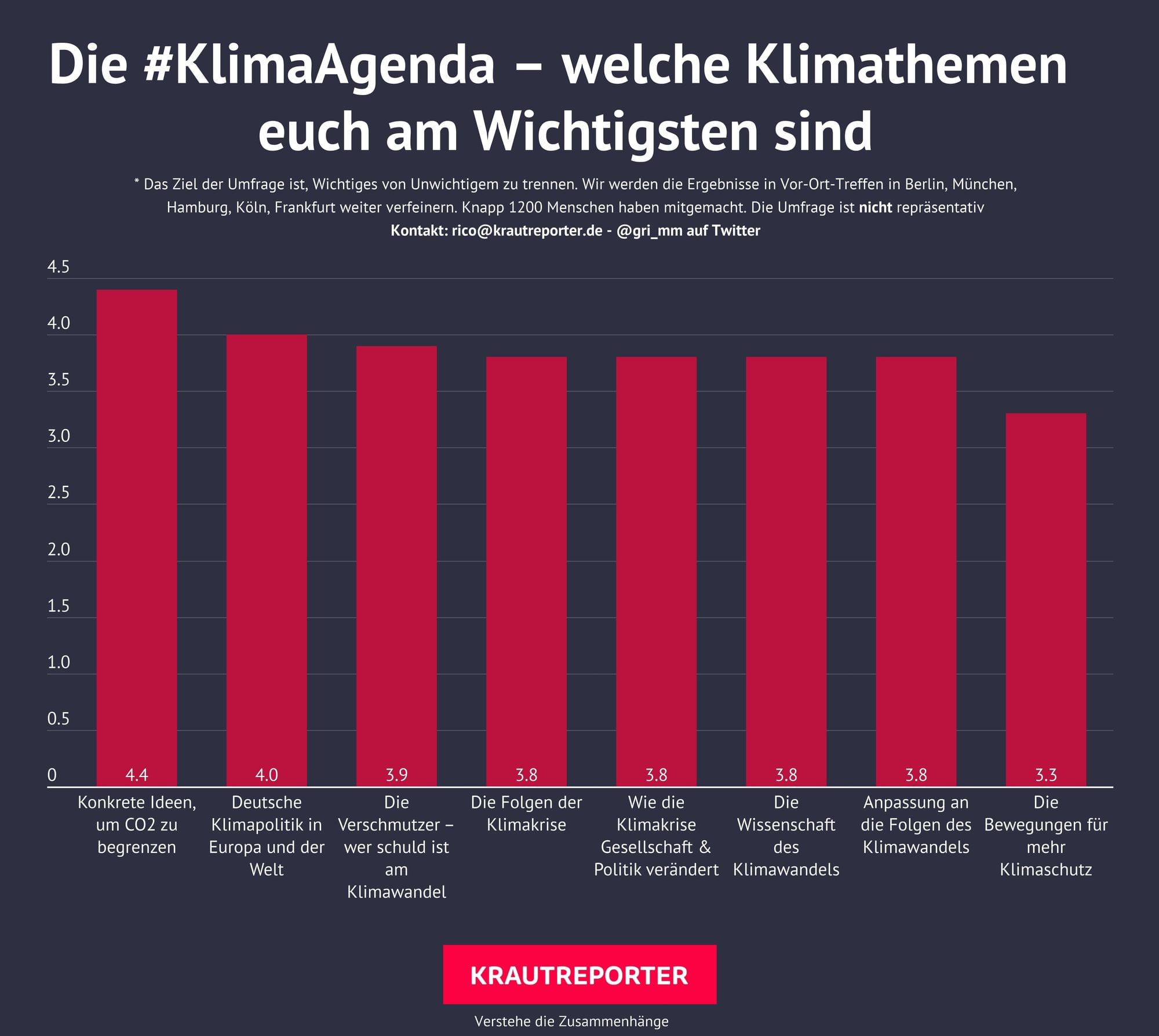 Vor drei Wochen habe ich euch eine hundsgemeine Aufgabe gegeben. Ihr solltet entscheiden, ob es wichtiger ist, über die Folgen von Hurrikans in der Karibik zu berichten oder über konkrete Klimalösungen, über Geo-Engineering oder die Verantwortung der großen Öl-Konzerne. Ich hatte es euch nicht leicht gemacht mit meiner Umfrage für eine #KlimaAgenda. Und doch: Mehr als 1.100 Menschen haben mitgemacht. Unser Ziel: auf das wirklich Wichtige konzentrieren.