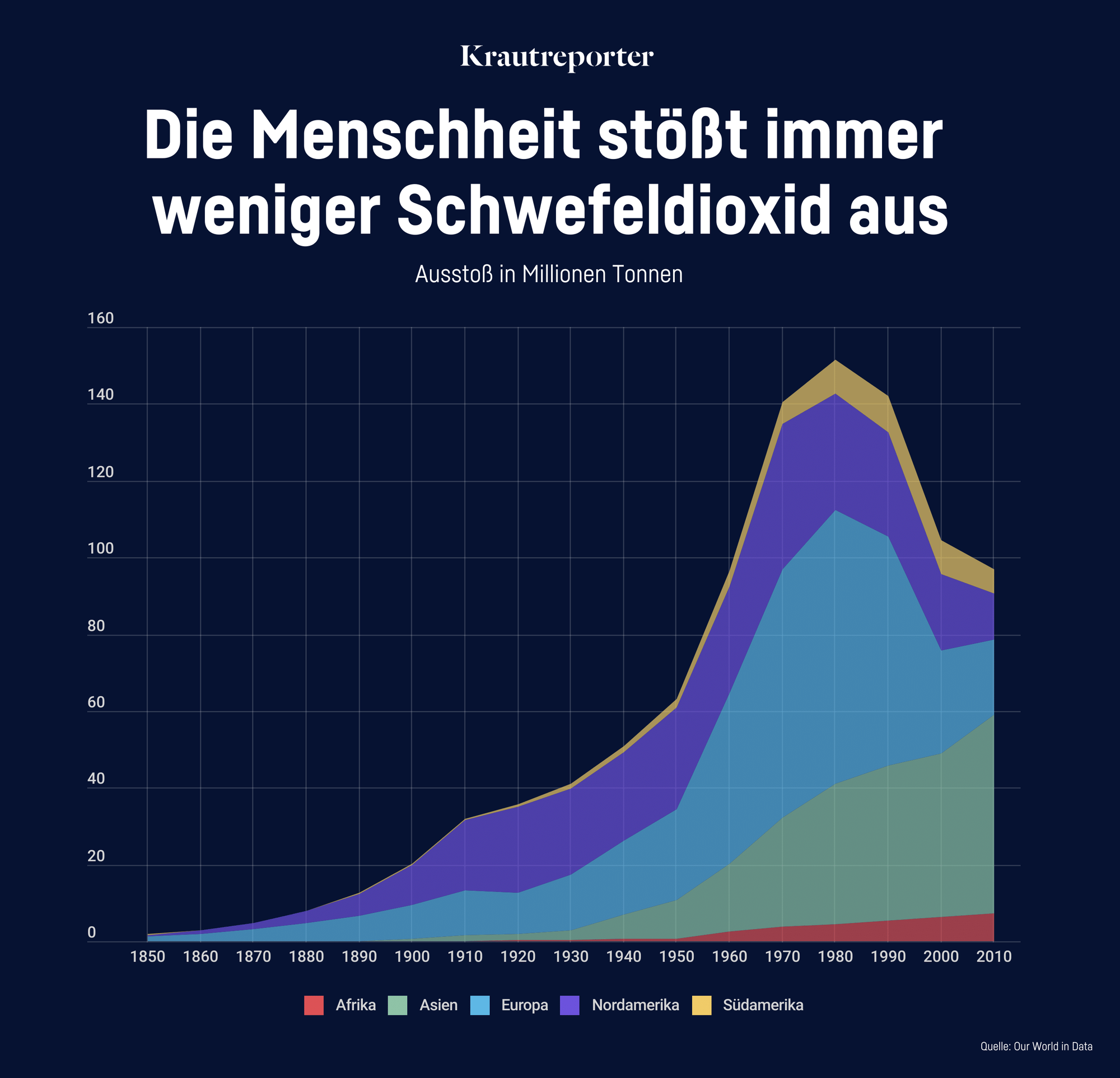 Jedes Jahr stößt die Menschheit etwas weniger als 100 Megatonnen an Schwefeldioxid aus. Die gesamte Menge hat, wie unsere Grafik unten zeigt, seit den 1980er Jahren vor allem dank strengerer Regeln in Europa und Nordamerika abgenommen. Sie ist aber immer noch circa 100-mal größer als in vorindustriellen Zeiten. In Asien und Afrika steigen die Emissionen aktuell, wobei gerade auch in Asien immer strengere Gesetze zum Schutz der Luftqualität verabschiedet werden, allen voran in China.
