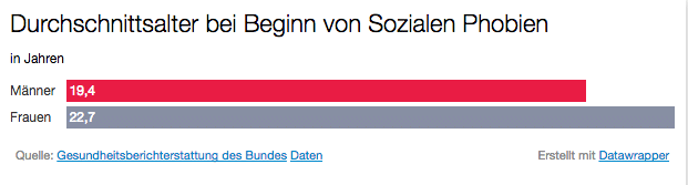 Im Gegensatz zu anderen Angststörungen erkranken die Betroffenen bereits früh, durchschnittlich mit Anfang 20. Generalisierte Angststörungen (Männer: 39,3 Jahre, Frauen: 33,6 Jahre) oder Panikstörungen (Männer: 35,2, Frauen: 29,2) treten eher später auf. Auffällig ist, dass häufig Jugendliche an Sozialer Phobie erkranken, nämlich mehr als jeder zehnte zwischen 14 und 20 Jahren. Dabei sind junge Frauen doppelt so oft betroffen wie Männer.