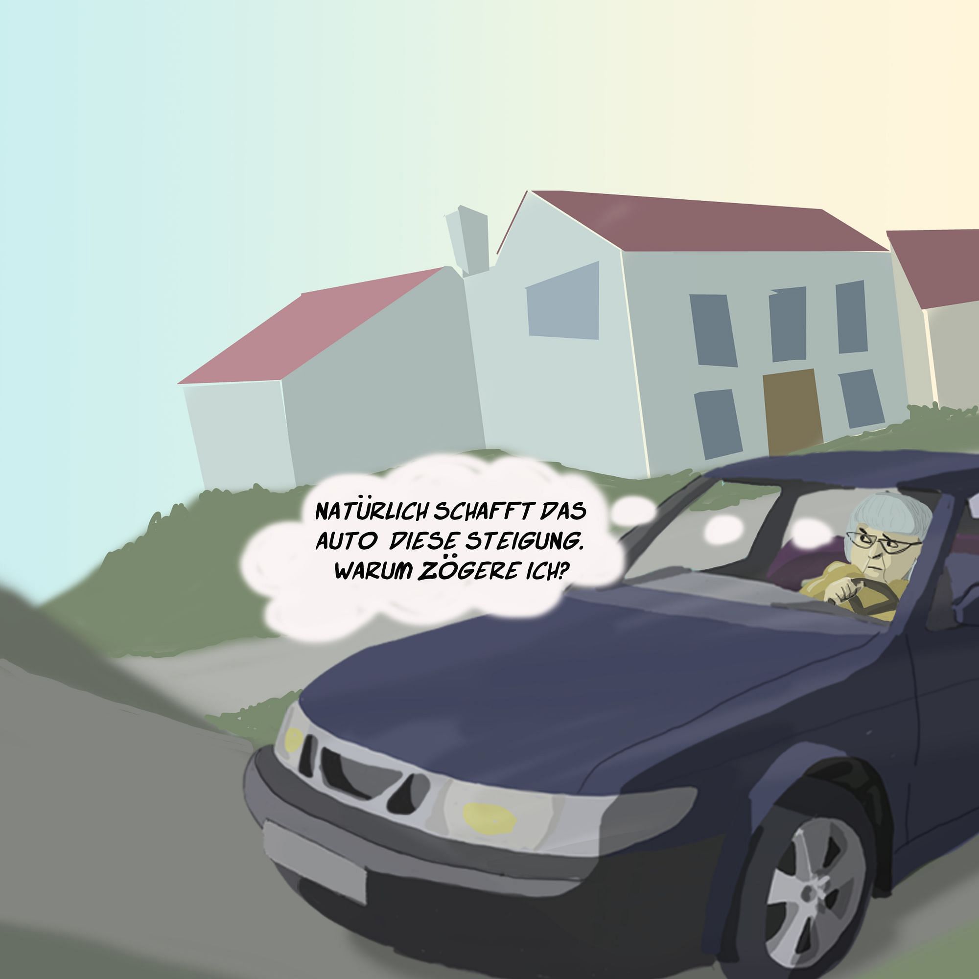 Sie steht vor einer Anhöhe, von der sie glaubt, sie sei zu steil für den Saab, was natürlich lachhaft ist. So ist das im Traum. Das hat sie lang genug geübt. So funktioniert seine Kontrolle.