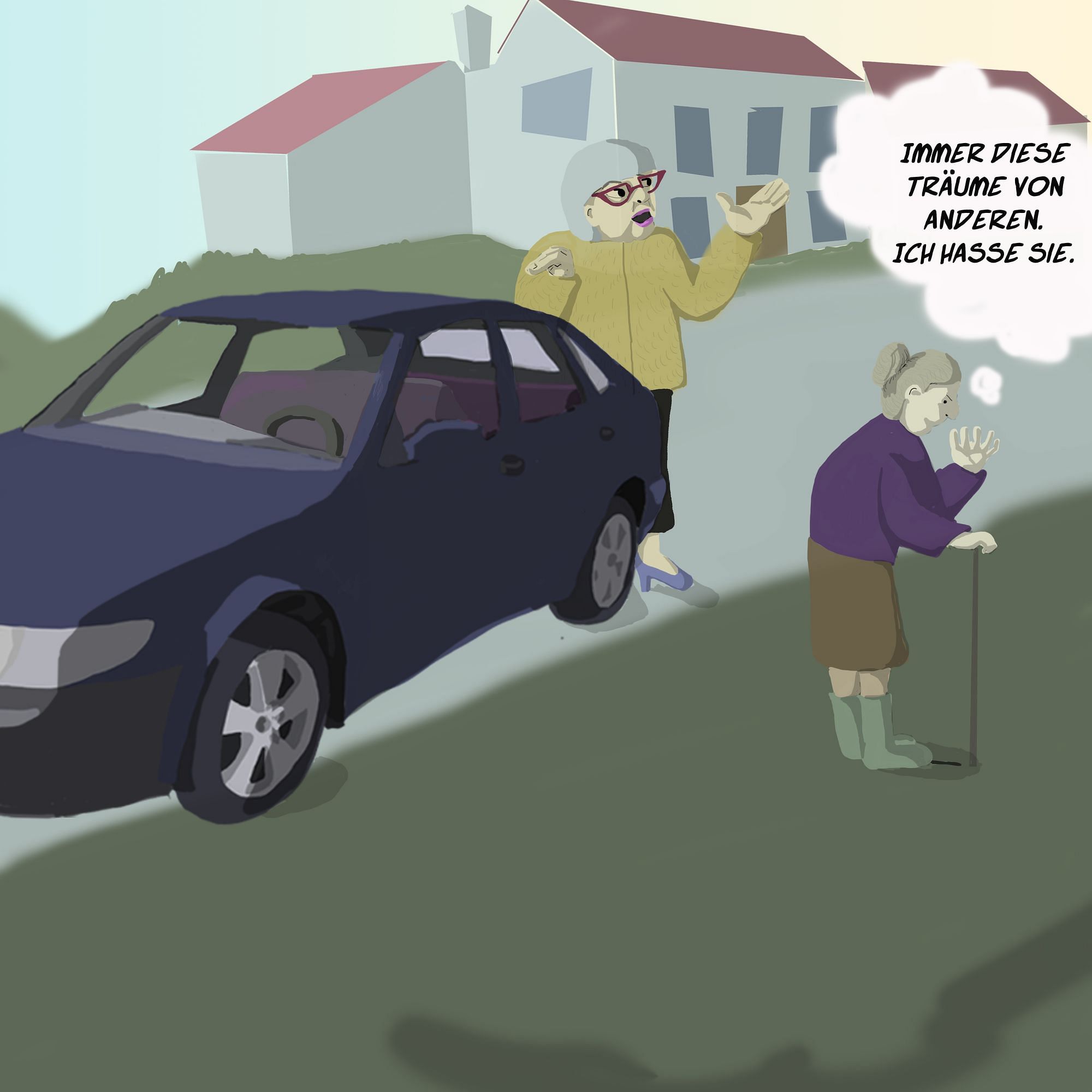 Im Traum bist du auf dich selbst gestellt. Andere um Hilfe zu bitten, ok, das kannst du natürlich versuchen, aber sie werden nur selten darauf eingehen. Elizavethas Traumregisseure nutzen alles, was in ihren Kräften steht, denn es geht darum, die Reise fortzusetzen. Die missbilligende Alte am Stock trägt ihren Teil zum Stück bei. Immer diese Träume von anderen! So gibt sie Elizavetha die Kontrolle zurück.