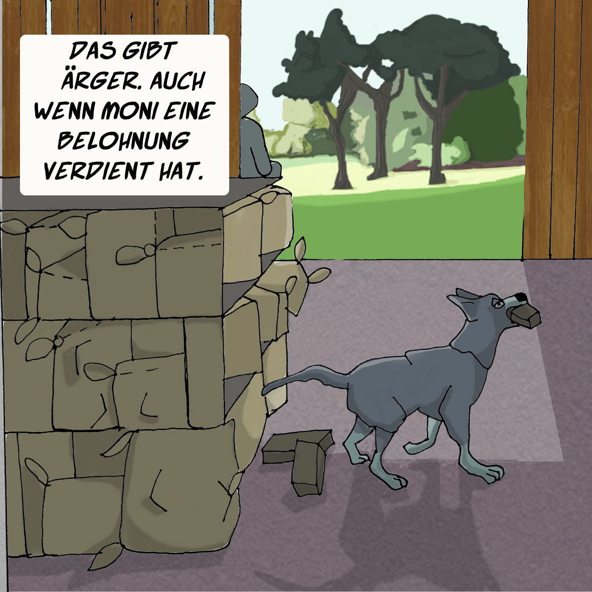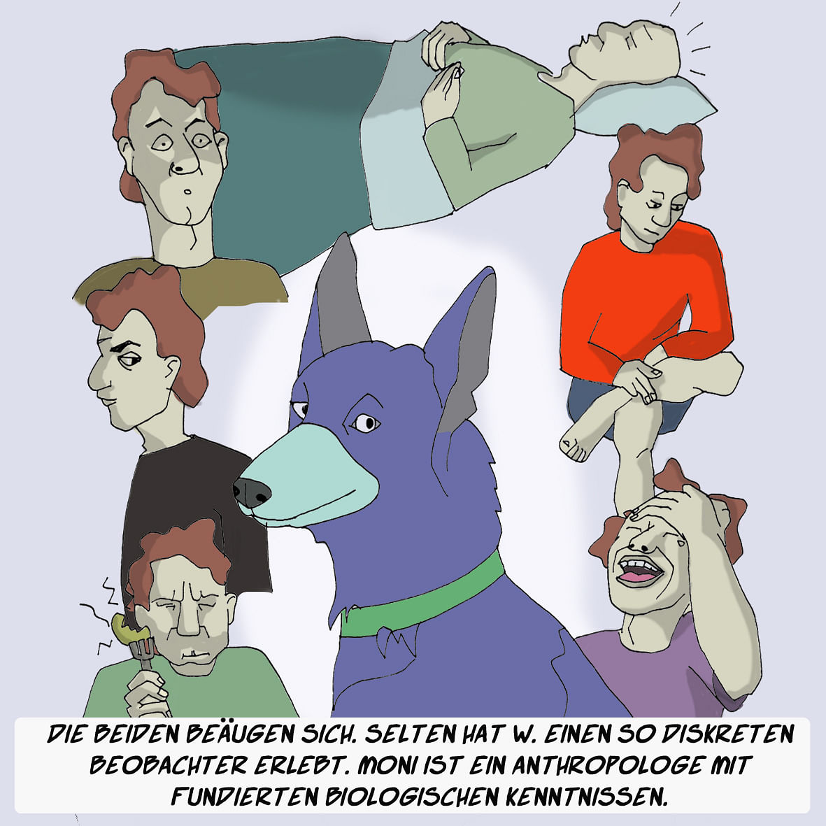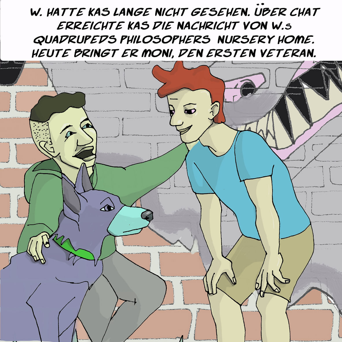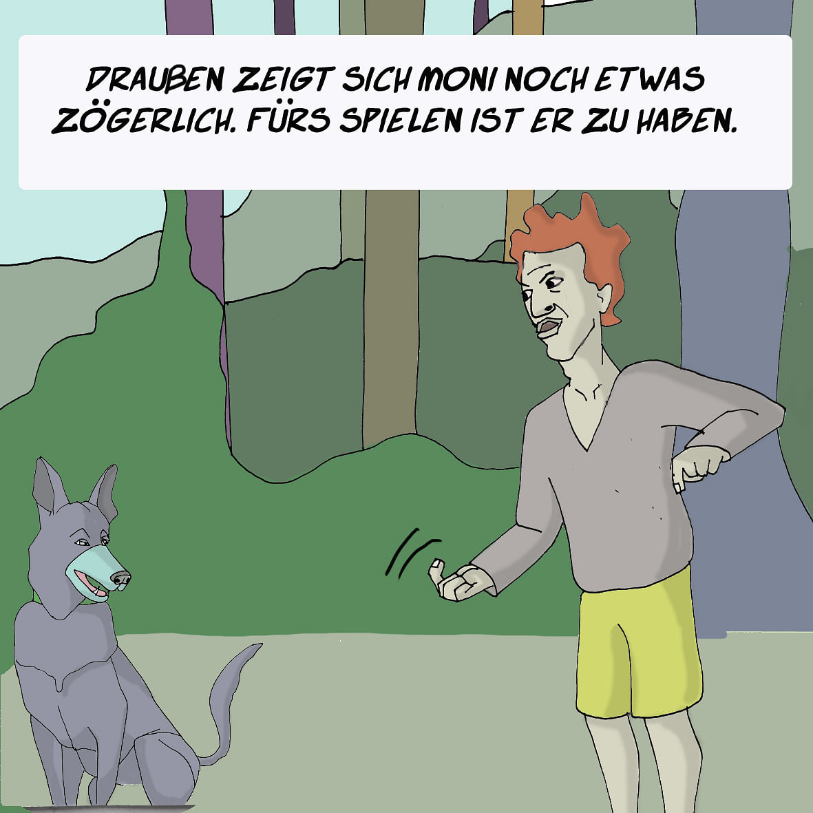 Hier sehen wir sie endlich das erste Mal draußen, was für Moni wirklich eine Abwechslung ist, die ihm gefällt, auch wenn er das nur vorsichtig andeutet. Von W. lernt er, im Handumdrehen, die Zeichensprache. Bald kann er sogar selbst mit dem Hundeleib gebärden.