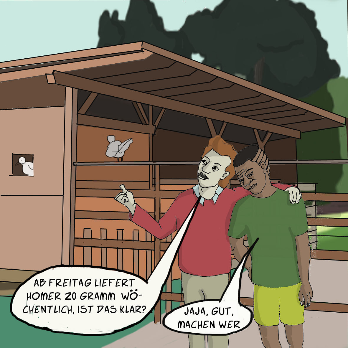 Der Deal kommt vor dem Streichelzoo zustande. W. hat in den Monaten, als er sein Pflegeheim für vierbeinige Philosophen plante, in Homer sein künftiges Dröhnchen erkannt. Er soll liefern.