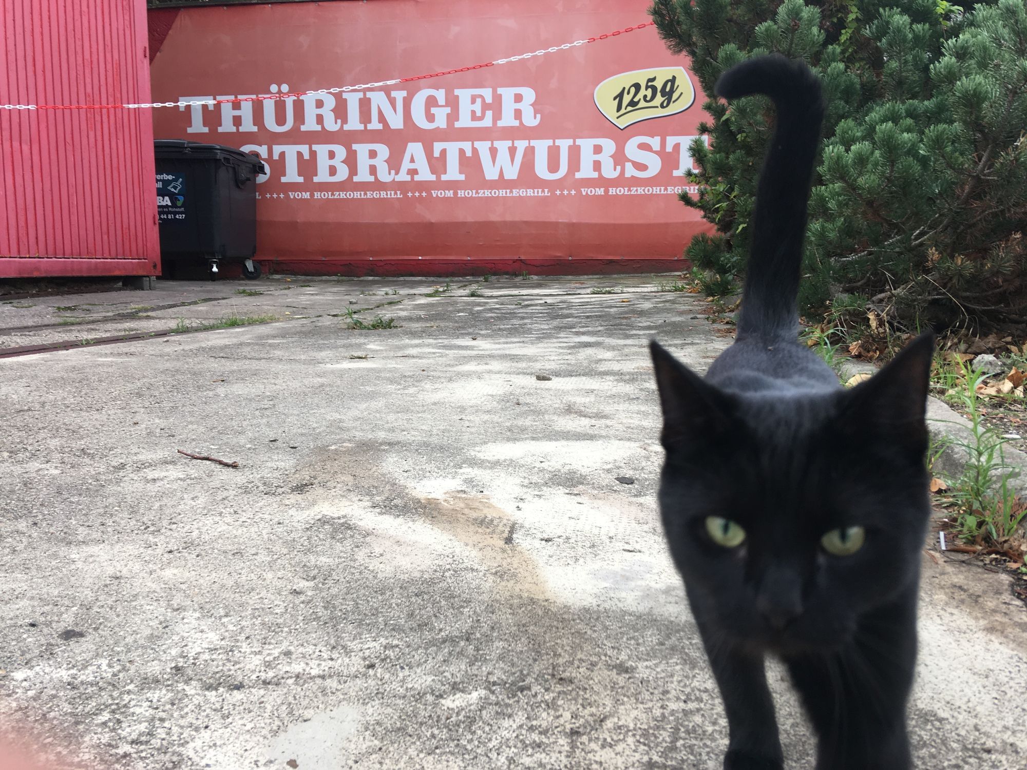 Es ist Sonntagnachmittag, ich stehe verkatert an einem Imbiss in Leipzig. Hinter mir brummt die Bundesstraße, vor mir im Kies schnurrt eine Katze. Sie hat erst so getan, als wollte sie nur an mir vorbeigehen, aber als ich mich hinhockte, kam sie gleich angestreunert, warf sich auf den Rücken und ließ sich den schwarzen Bauch kraulen.