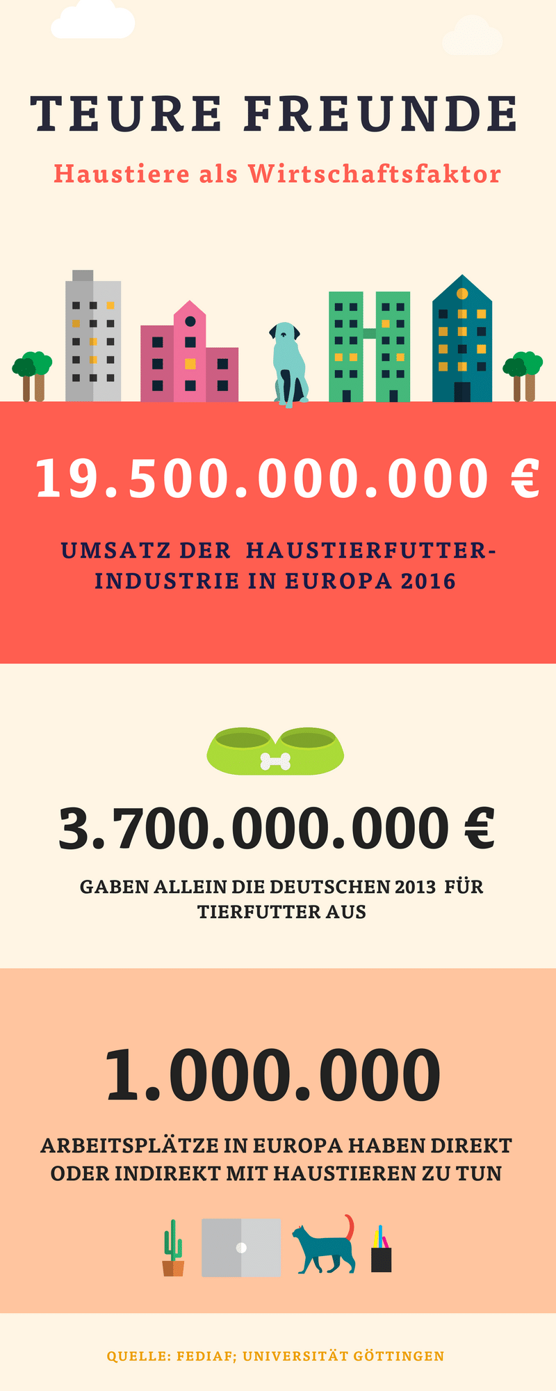 Gerade die Deutschen lassen sich ihre Lieblinge etwas kosten: 3,7 Milliarden Euro gaben sie laut einer Studie der Universität Göttingen 2013 allein für ihr Futter aus, fast so viel wie für Bücher. Aber auch die übrigen Bewohner Europas lassen sich nicht lumpen. 19,5 Milliarden Euro hat die Heimtierindustrie in Europa 2016 umgesetzt.