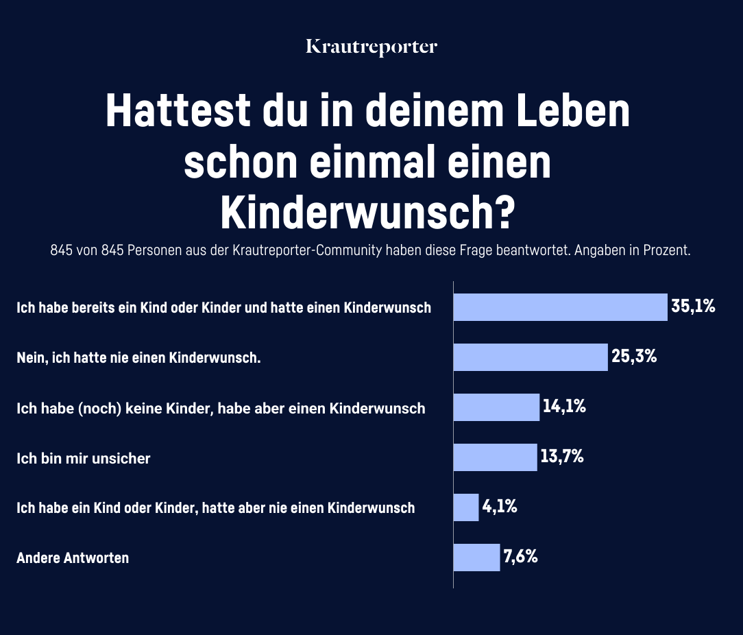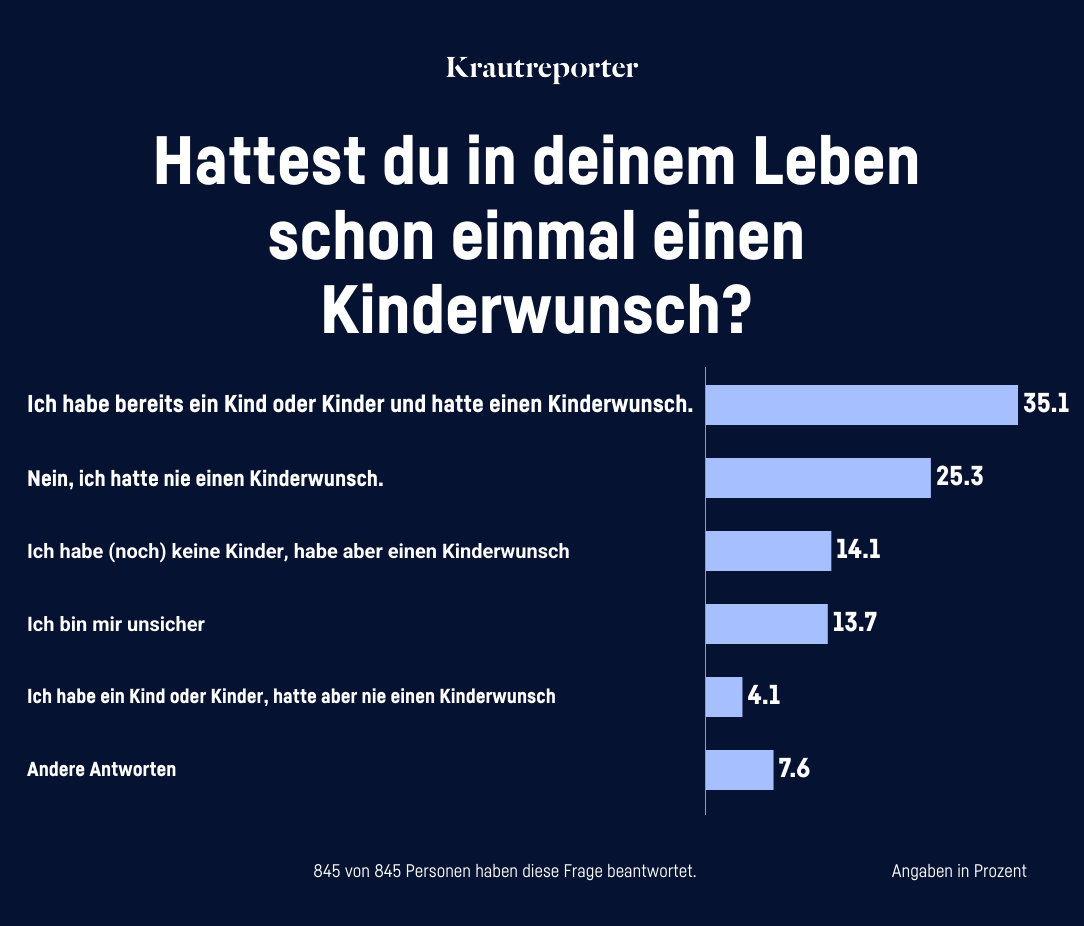 In einer Umfrage in der KR-Community, an der sich mehr als 800 Leser:innen beteiligt haben, sagte ein Viertel explizit, dass sie nie einen Kinderwunsch hatten. Mehr als vier Prozent sagten, sie hätten zwar Kinder bekommen, aber nie zuvor das Bedürfnis gehabt. Andere spürten den Wunsch, später aber verschwand er wieder.